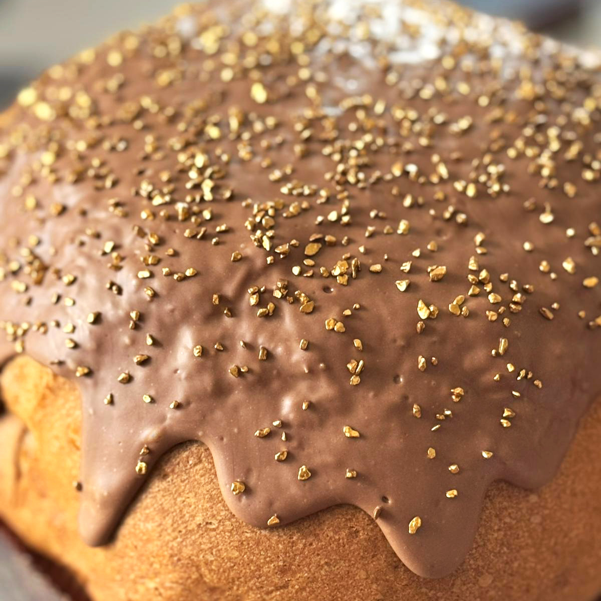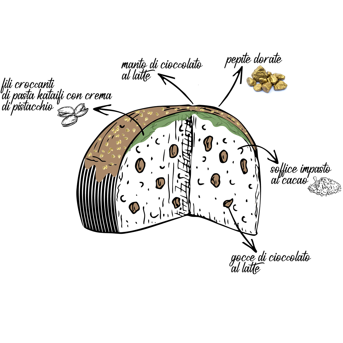 Farina di GRANO tenero, BURRO 20%, chunks di cioccolato al latte 12% (zucchero, LATTE, burro di cacao, pasta di cacao, Emulsionante: lecitina di SOIA, aroma naturale di vaniglia, Cacao min. 30%), zucchero, tuorlo d’UOVO fresco di Cat. A da galline allevate a terra 8%, pasta di cacao, pasta d'arancia (scorza d'arancia, sciroppo di glucosio-fruttosio, zucchero), miele, LATTE magro in polvere, lievito madre, lievito di birra, sale, aromi naturali, Emulsionanti: mono e di gliceridi degli acidi grassi.Copertura 19%: crema al PISTACCHIO Dubai style 58,5% (zucchero, PISTACCHI siciliani 30%, pasta kataifi 10%(farina di FRUMENTO, acqua) olio di girasole, proteine del LATTE, aromi) cioccolato al LATTE 39% (zucchero, burro di cacao, LATTE intero in polvere, pasta di cacao, Emulsionante: lecitina di SOIA, aroma naturale di vaniglia, Cacao min 35%) pepite perlescenti oro al cioccolato 2,5% (zucchero, pasta di cacao, burro di cacao, emulsionante: lecitina di soia, gommalacca, coloranti: E555, E172)