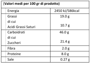 Farina di FRUMENTO, zucchero, BURRO fresco 20%., Cioccolato puro fondente belga 16% (massa di cacao, zucchero, Emulsionanti: lecitina di SOIA, aroma naturale di vaniglia), tuorlo d’UOVO fresco di cat. A da galline allevate a terra, cioccolato fondente (zucchero, massa di cacao, cacao magro in polvere), lievito madre, lievito di birra, miele, sale, aromi, Emulsionanti: mono e di gliceridi degli acidi grassi.